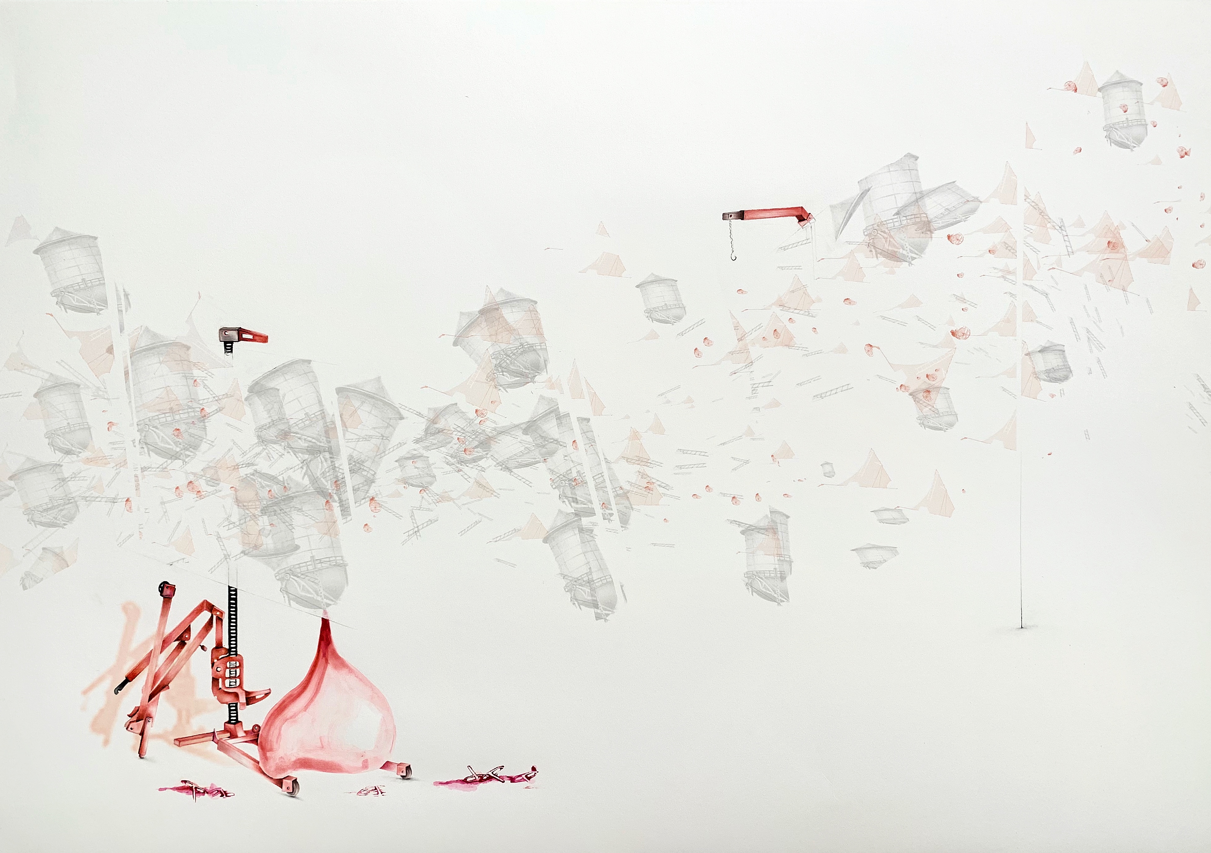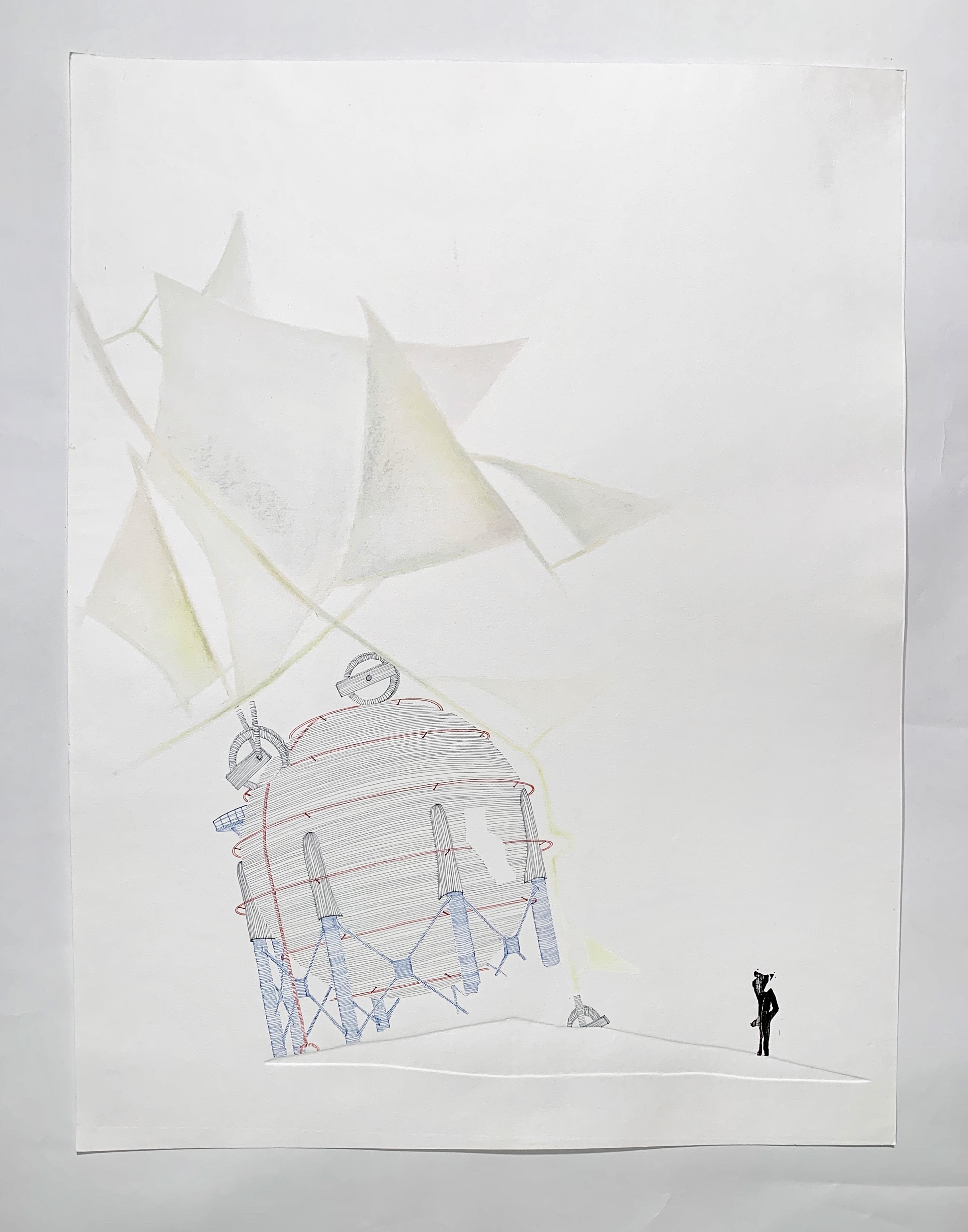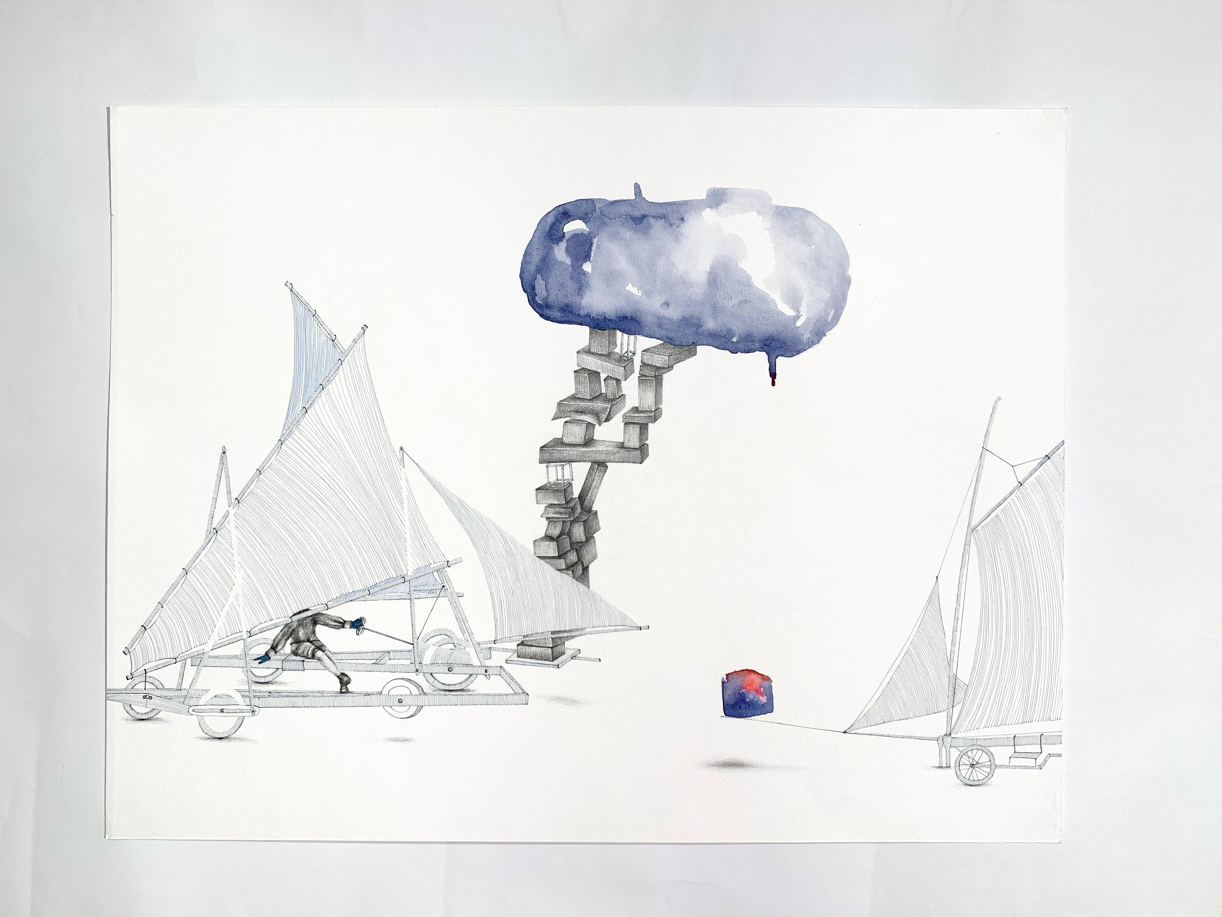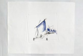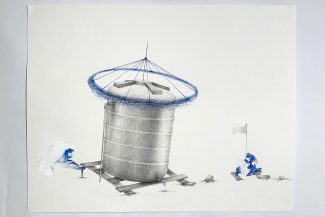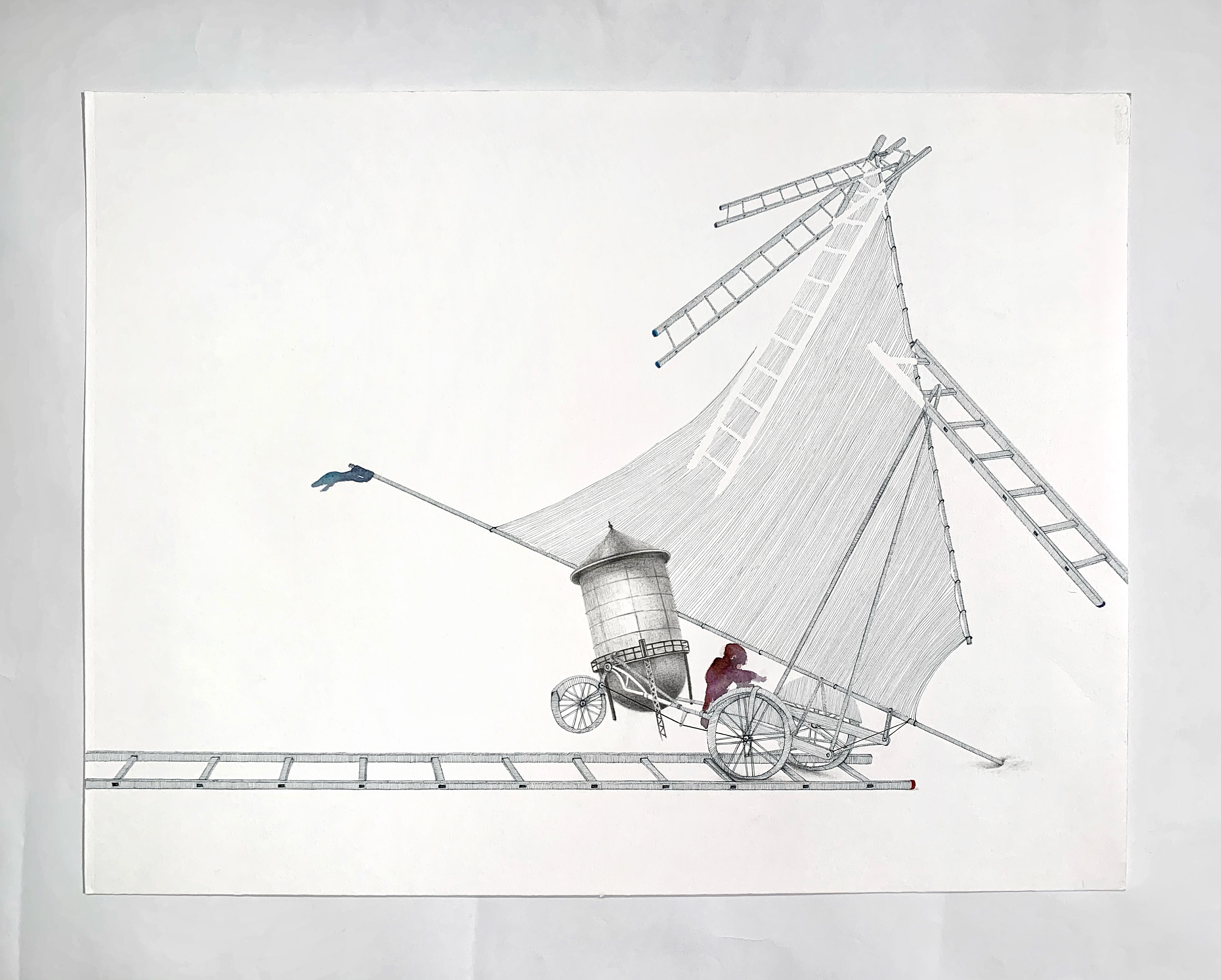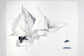 “In the Suspicion series, Seddigh explores the possible associations/permutations between “aéroplage” (land sailboats), water tanks, and figures. Alternating pastel, acrylic, watercolor, pen and ink, charcoal, linocut, linoleum, digital print, and oil, the artist alternately characterizes each element and experiences how the relationship between them is shaped.”