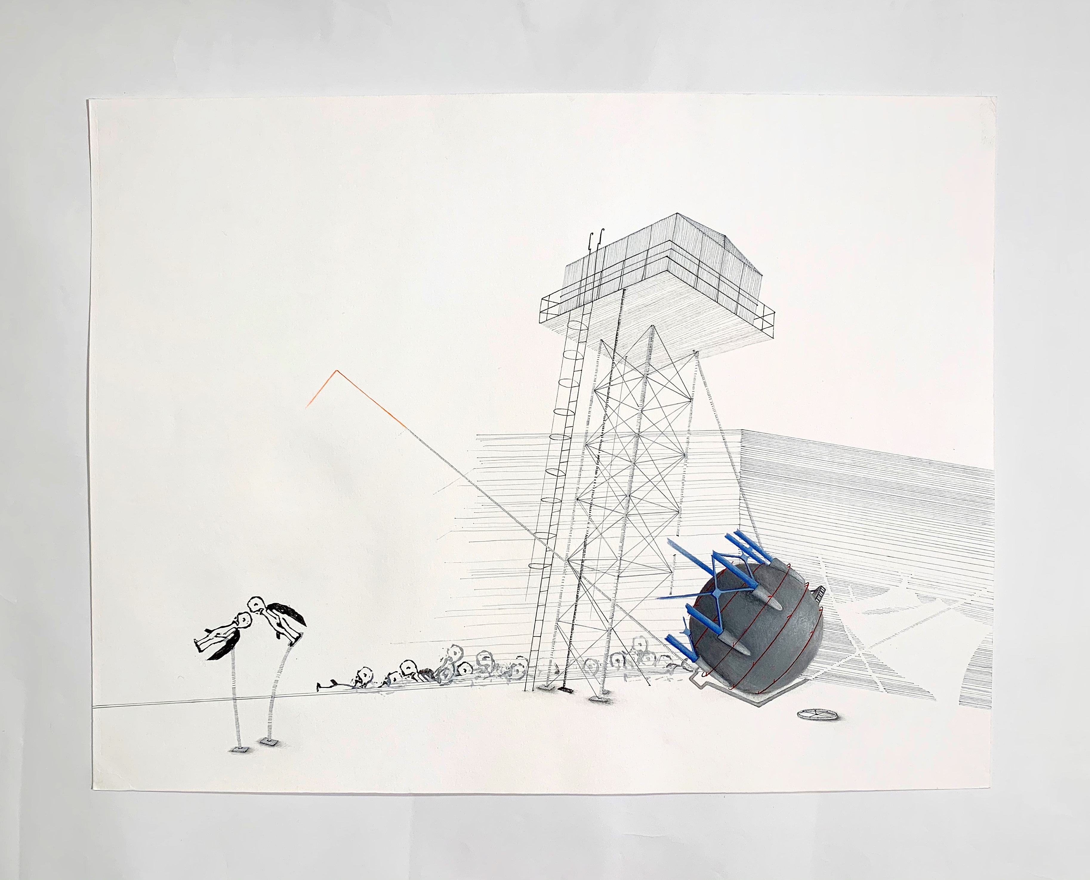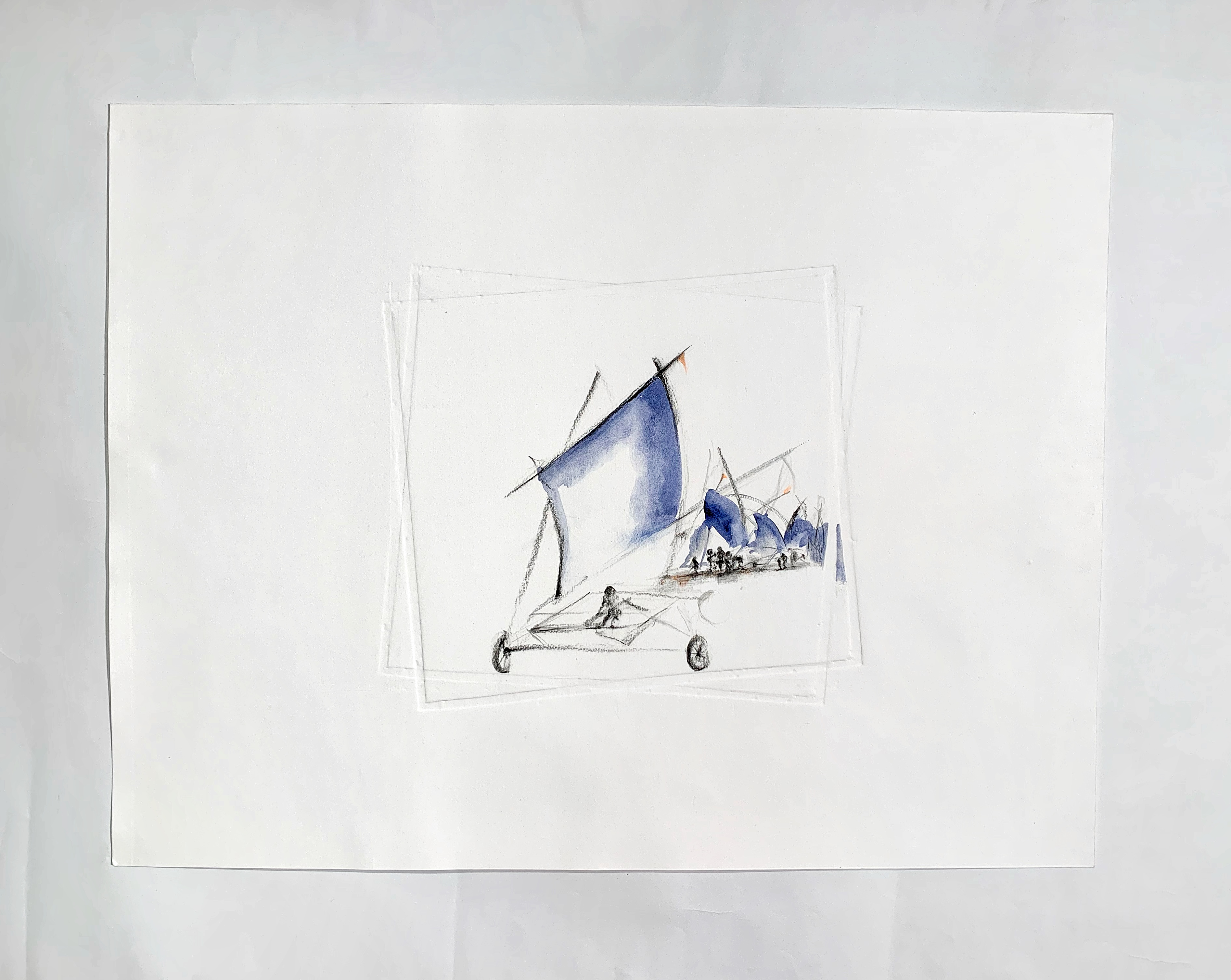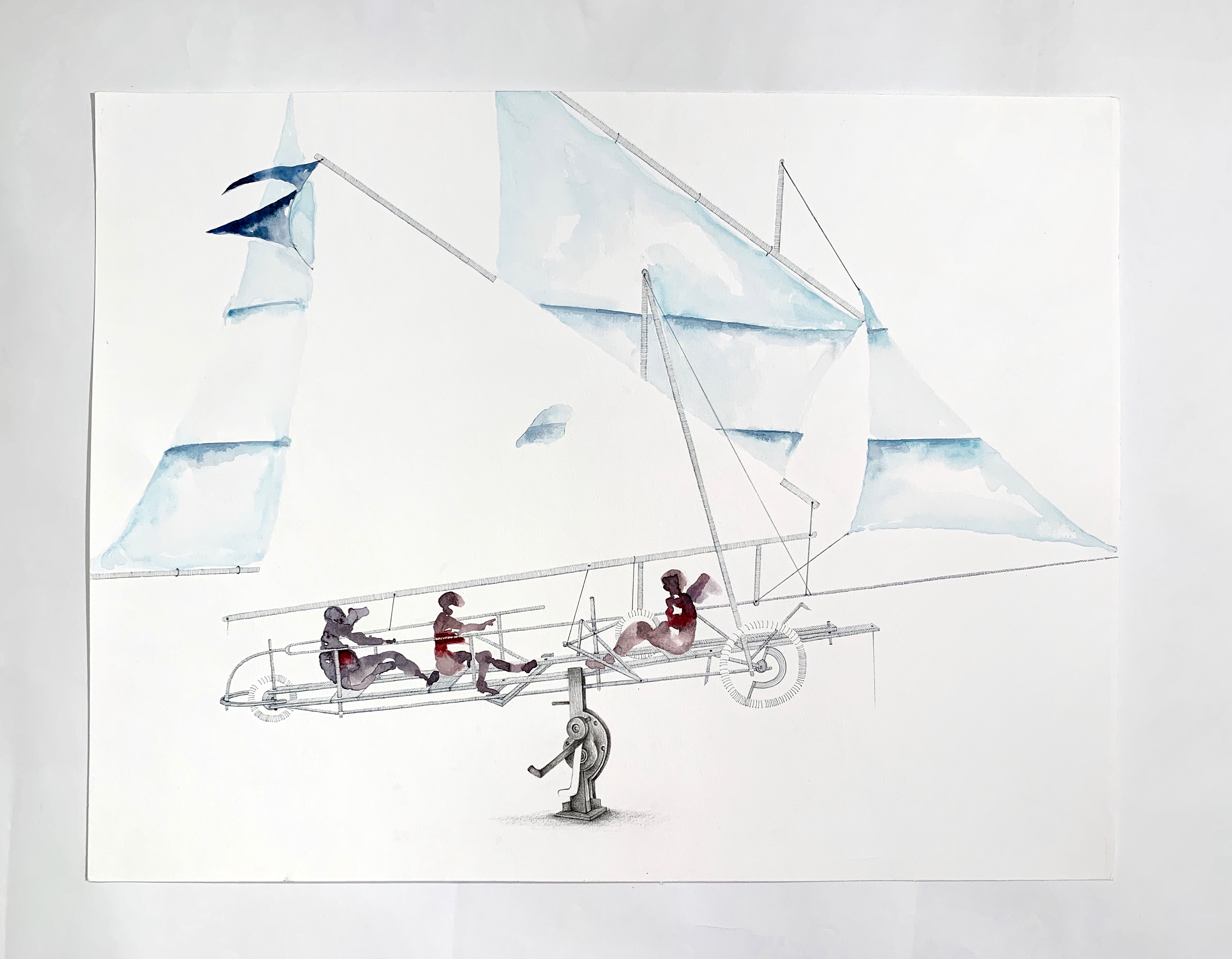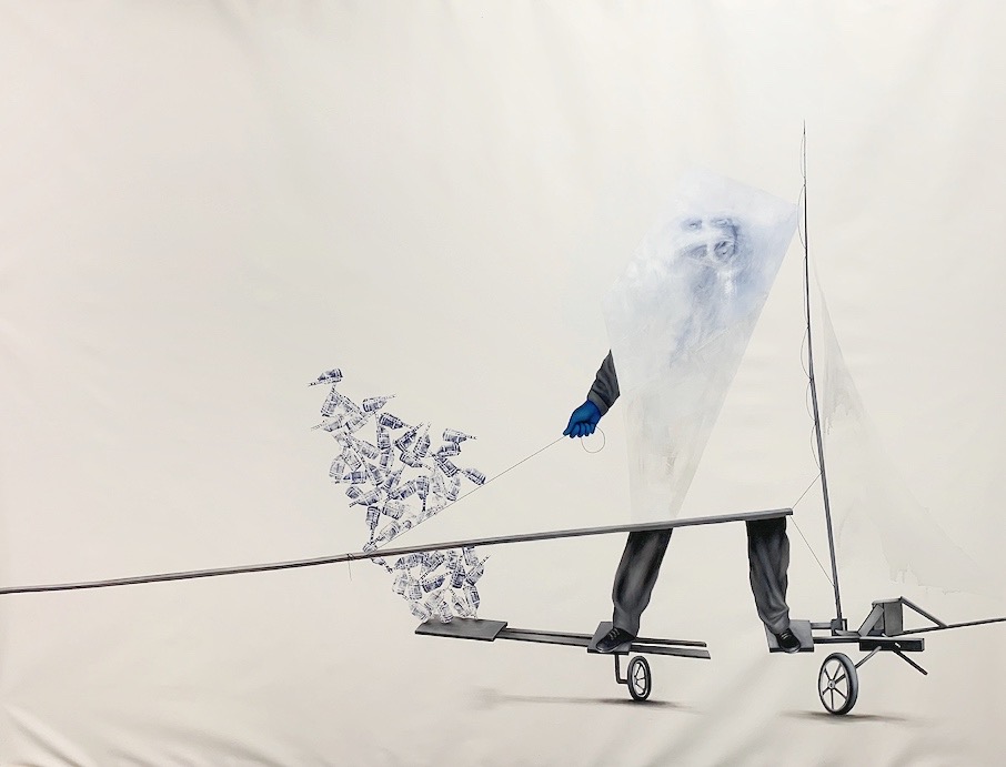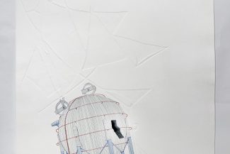 “In the Suspicion series, Seddigh explores the possible associations/permutations between “aéroplage” (land sailboats), water tanks, and figures. Alternating pastel, acrylic, watercolor, pen and ink, charcoal, linocut, linoleum, digital print, and oil, the artist alternately characterizes each element and experiences how the relationship between them is shaped.”