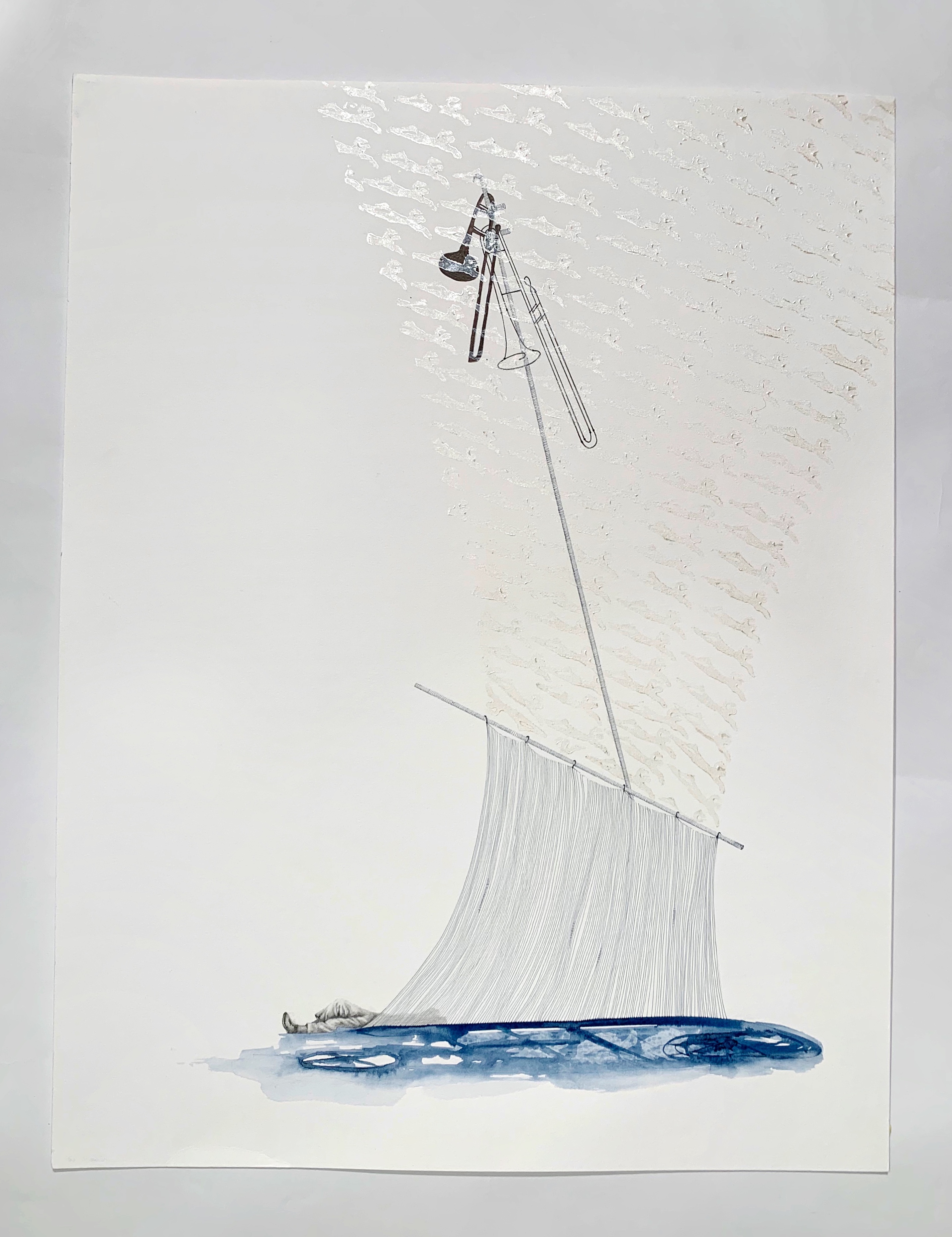 Acrylic, charcoal pencil and embossing on paper