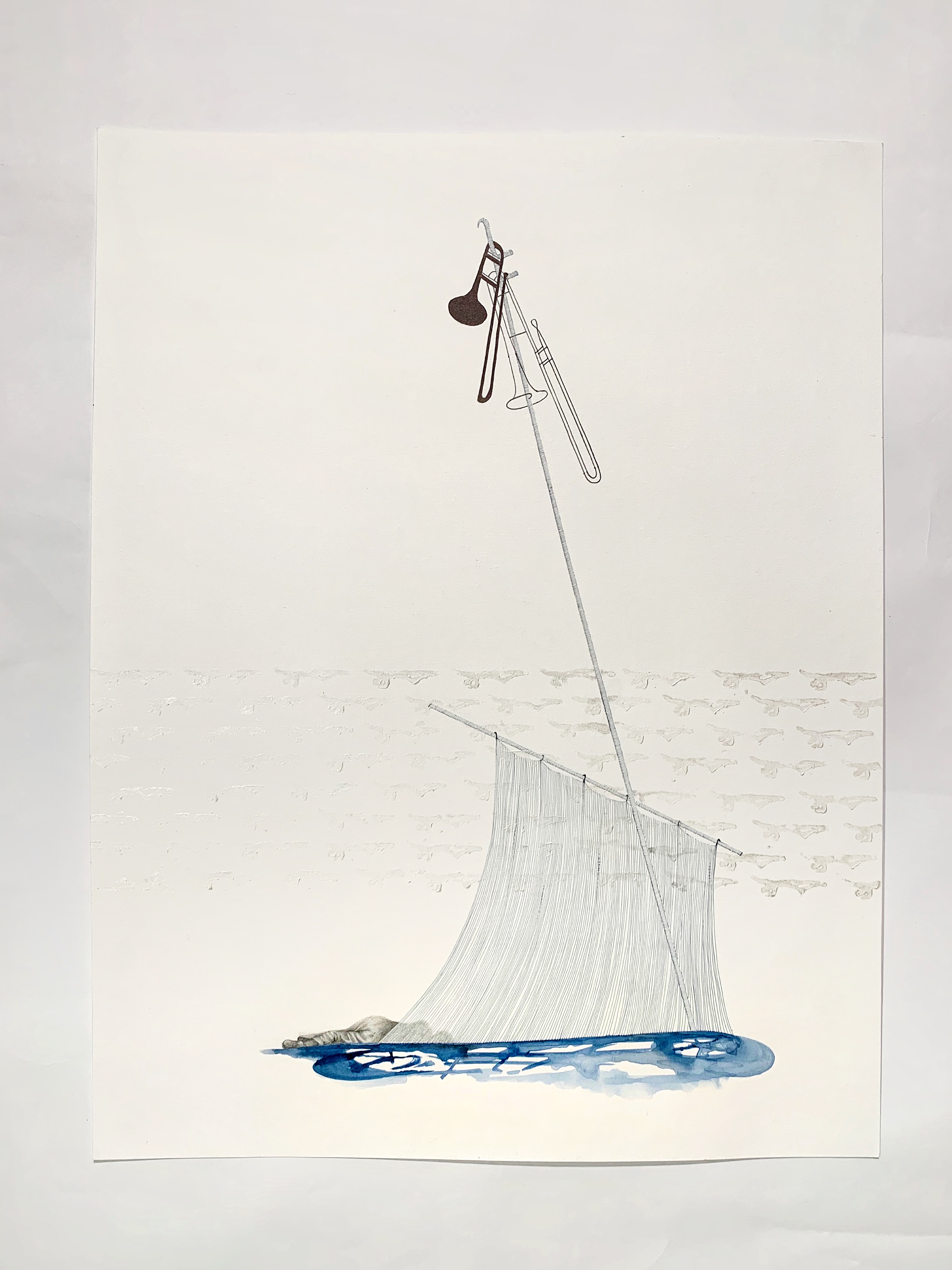 Acrylic, ink pen, linoleum and pastel on paper