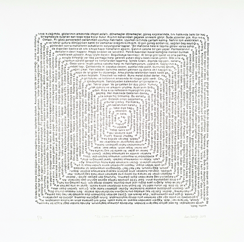 The lines written by the artist regarding her personal experience and sections from her production process, are being printed on different materials such as stone, cotton and embossing which try to create a new form of expression between the material and the thinking process of Seddigh while being transformed into original prints.